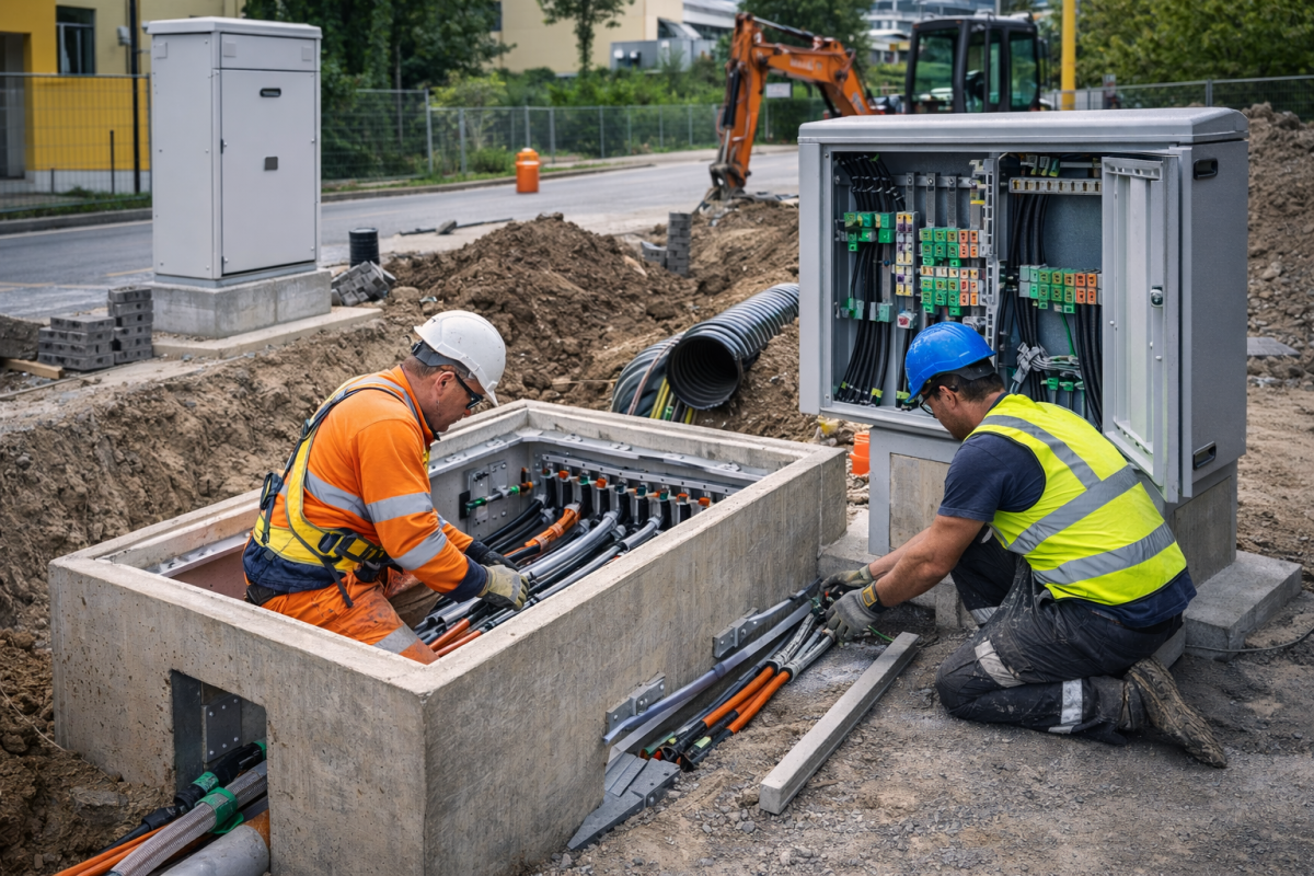 Nous réalisons la création et la transformation de chambres techniques et de chambres à câbles, qu’elles soient préfabriquées ou conçues sur mesure, jusqu’à une profondeur de 100 cm. Ces interventions sont menées avec une maîtrise complète des contraintes de terrain et des exigences techniques propres aux réseaux d’énergie et de télécommunications.
